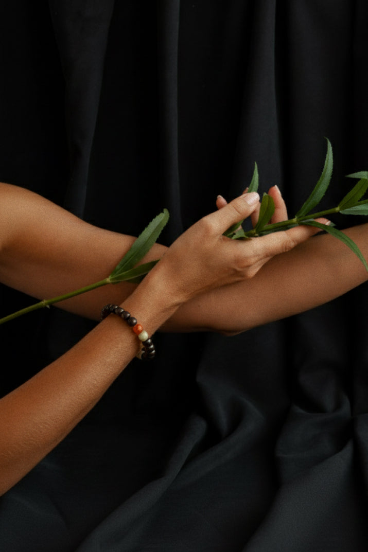 Each Mudi Bracelet is handcrafted from ethically pruned Bodhi roots — symbolizing growth through letting go. The beads’ warm, organic texture evolves with time, deepening in color as it absorbs your touch and energy.
